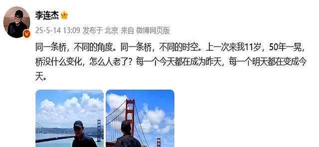 他上传了两张与大桥的合影,配文写说念:“并吞座桥,不同的视角。并吞座桥,不同的光阴。前次来这里我才11岁,五十年一会儿即逝,桥梁依旧,仅仅东说念主已老去?每一个今天齐在酿成昨天,每一个翌日齐在成为今天。”