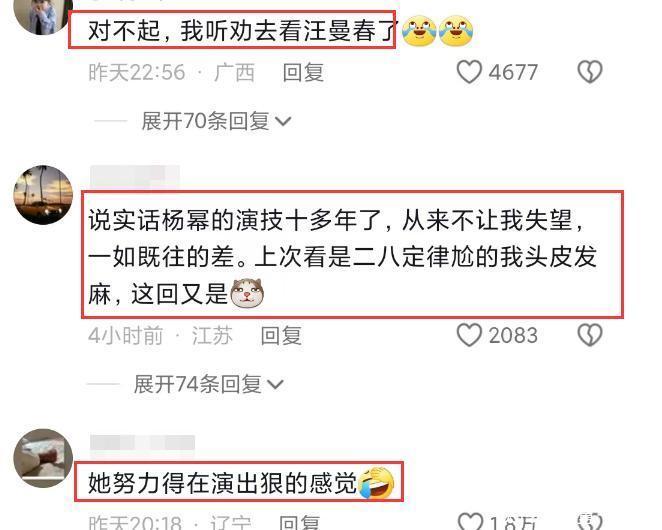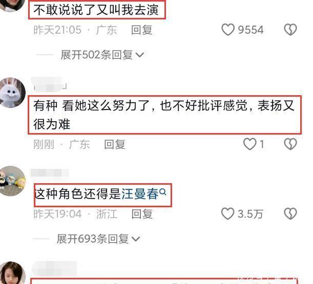 翻看路东说念主盘的评价,对杨幂的施展险些是清一色的差评,王鸥的汪曼春也成为被说起最多的一个对比脚色,“这种脚色还得是汪曼春”“抱歉,我听劝去看汪曼春了”。