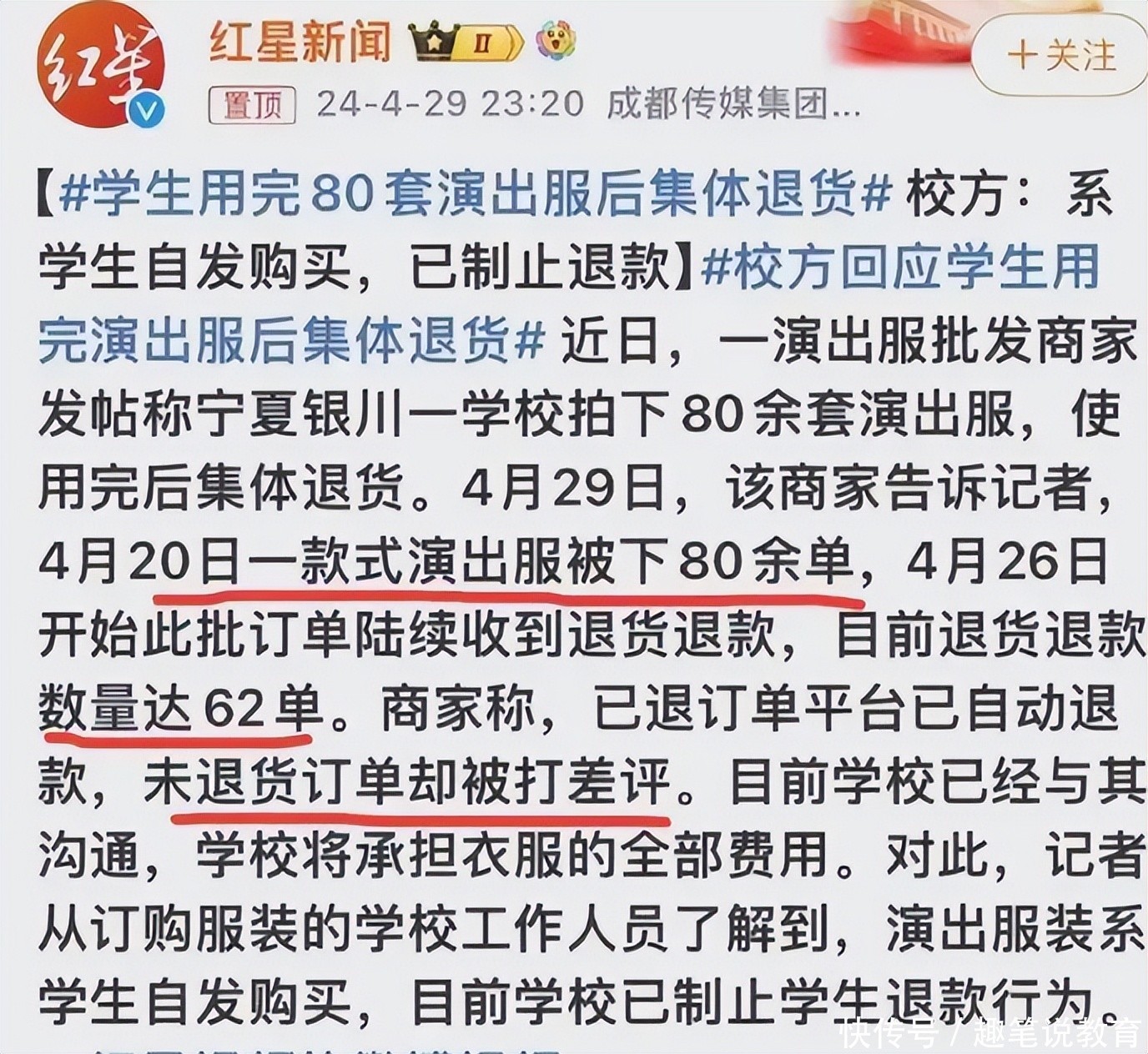 bet365 china对于宁夏某学校,因为学校上演,学生买了80套上演服,退掉62套的事情,被网友们骂惨了。
